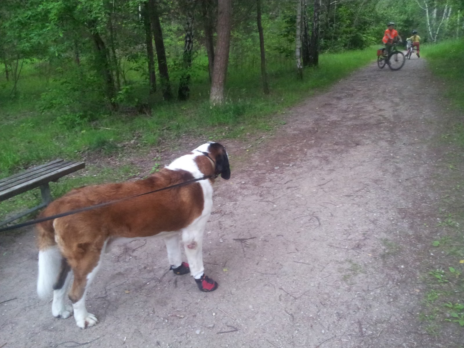 Iš karto už kryžiaus, lygiagrečiai Laisvės prospektui miške eina takas. Juo pavažiavau iki pėsčiųjų tilto, tada – per tiltą į kitą Laisvės prospekto pusę, tada – L. Asanavičiūtės gatve į kairę link liūdnai pagarsėjusio Pasakų parko. Pasakų parke – daug medinių skulptūrų pasakų motyvais ir senbernaras su batais.