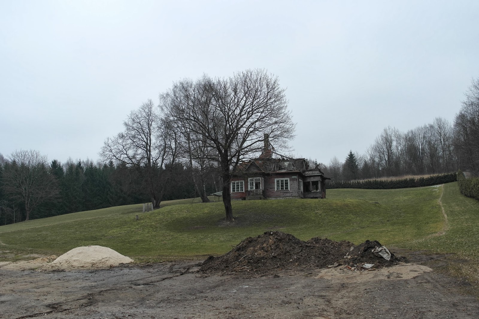 Nuo to statinių komplekso pavažiavau link Naujosios Vilnios palei didžiulę tvorą, už kurios graži pieva, sodas ir sudegęs namas.